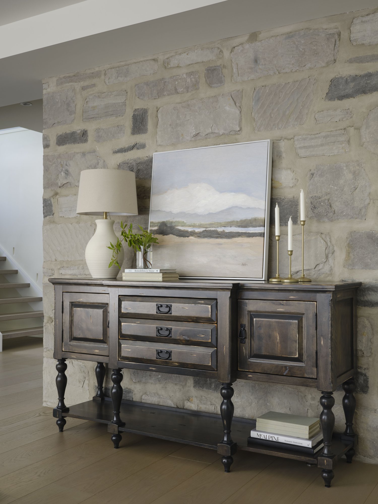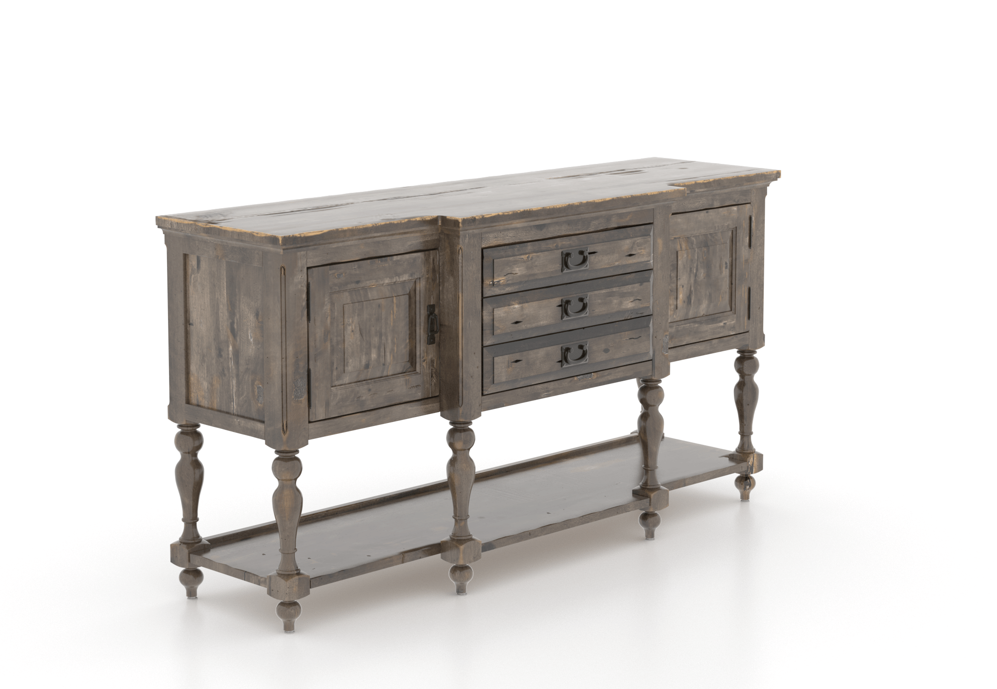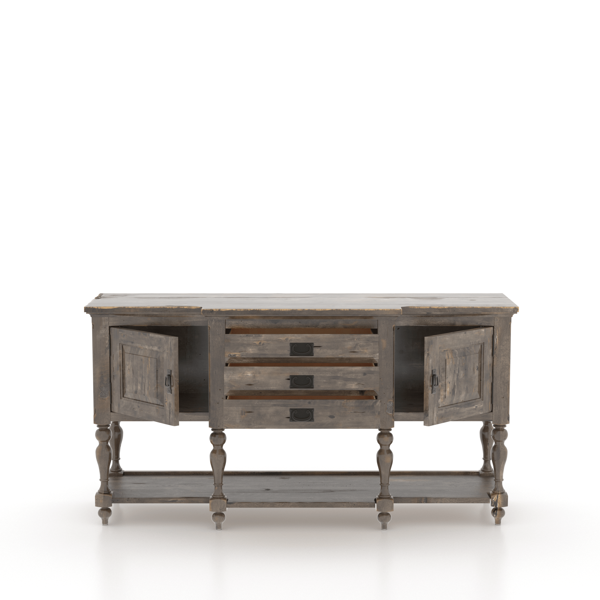 Here is a beautiful classic-style buffet with a romantic cozy look! Its beautiful crafted legs and open shelf make it delicate and elegant. You will also appreciate the beauty of its distressed finish.