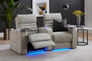 The luxurious Catalina is the ultimate spot for enjoying your favourite media. Modern channelled detailing boasting 1.5″ of memory foam in each channel will conform to your body and cradle every contour as you melt into your seat. Full pad-over chaise with extended footrest leaves no part of your leg unsupported, with a welcome bit of extra room for taller occupants. At the push of a button, power lumbar, headrest, and recline will smoothly move to your favourite viewing position, which can be saved and returned to over and over with the memory key function. All functions, including LED lighting in the cupholder with seven different colour choices and three intensities, are conveniently controlled from the cupholder. An integrated smart USB port keeps devices charged. Extra storage can be found in the wide arms, with optional grommets to add on a table, tablet holder, wineglass holder, or flex light. With sleek contemporary styling and the best in modern functionality, the Catalina will soon become the most coveted seat in your home theatre.