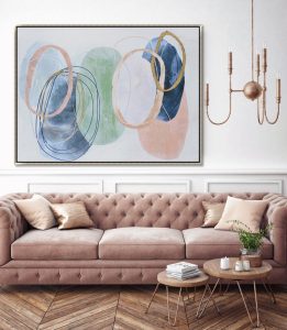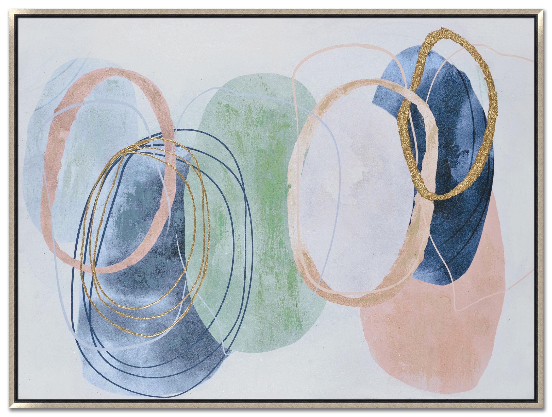 Oil painting on gallery wrapped canvas with metallic foiled accents in a light gold floating.