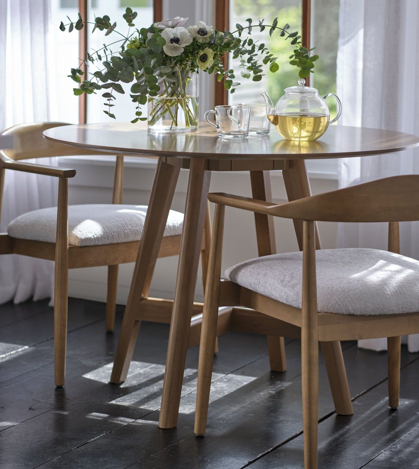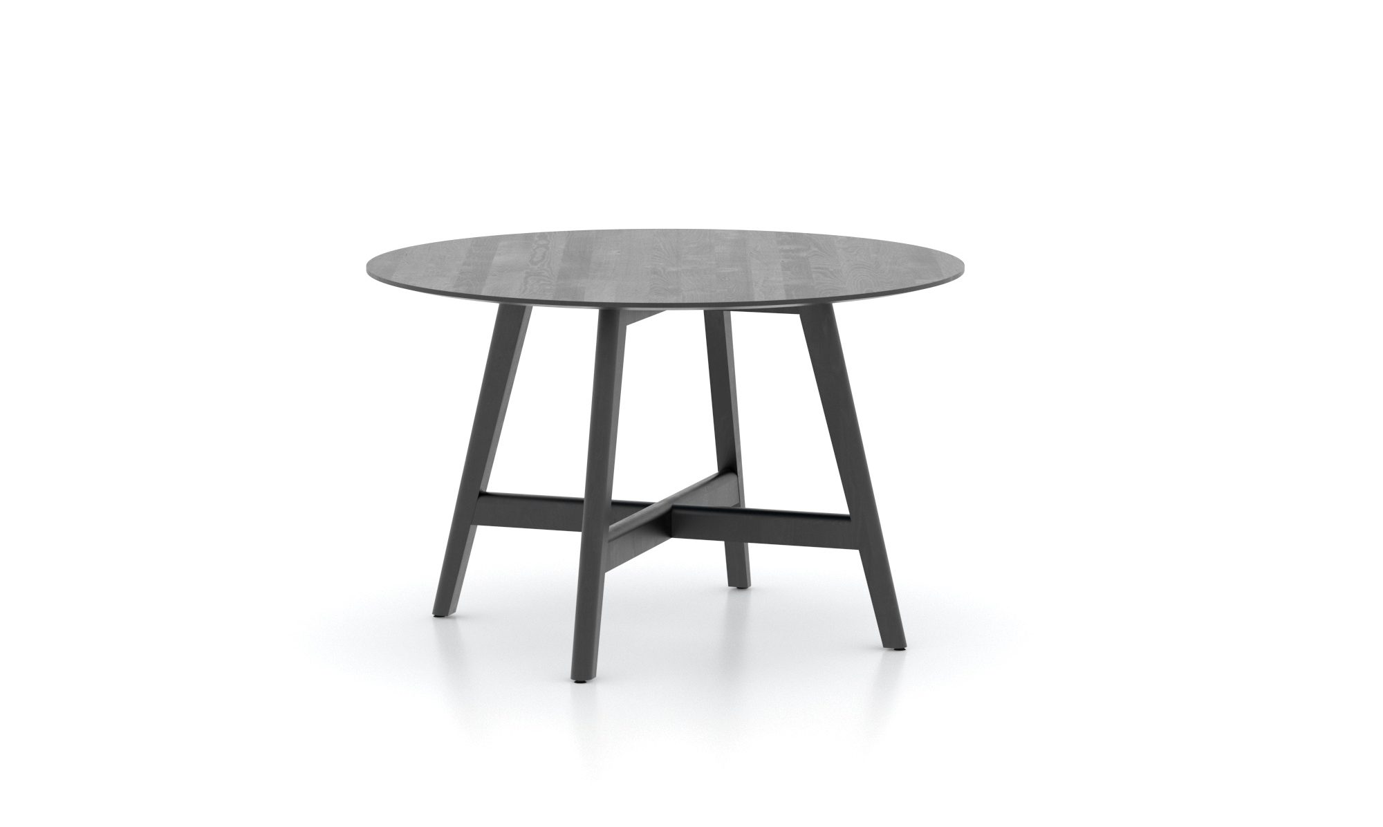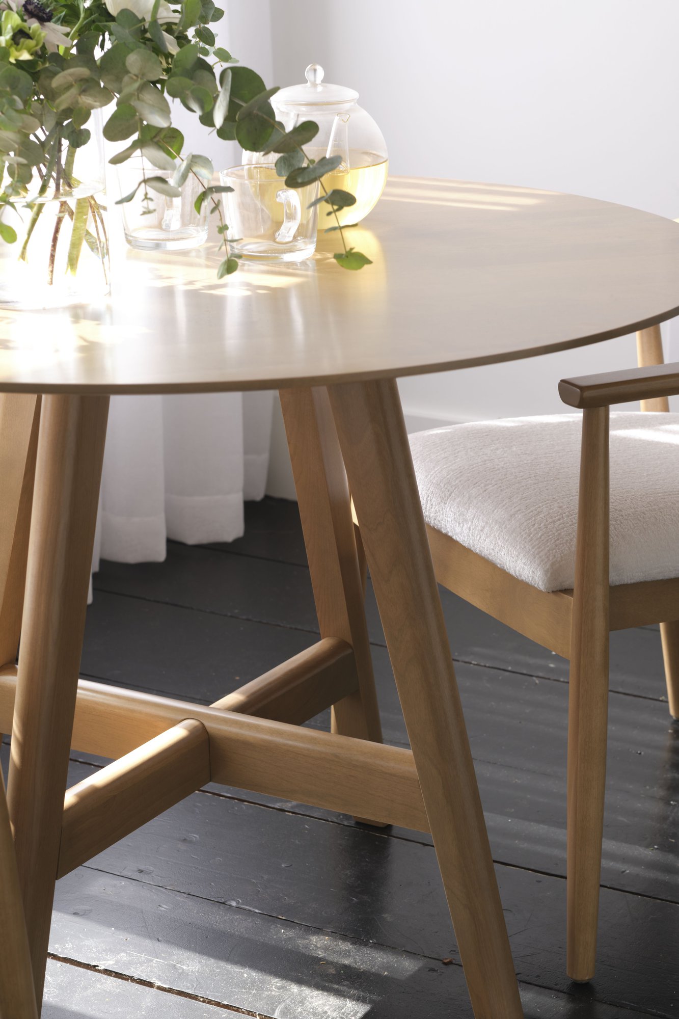 This simple yet stately round table is a tasteful addition to any contemporary dining room. Made from solid wood in an incredibly smooth finish, this piece will enhance your decor, creating a friendly and refined setting.