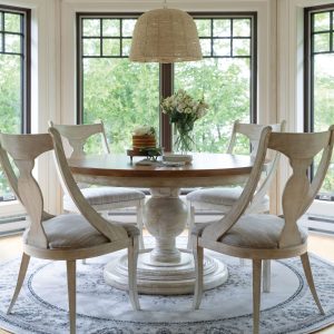 Enhance your decor in an amazing way with this elaborate round table sporting a spherical base and wide legs.