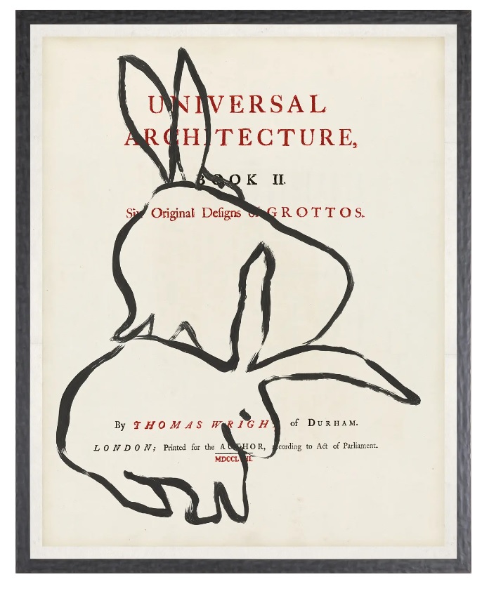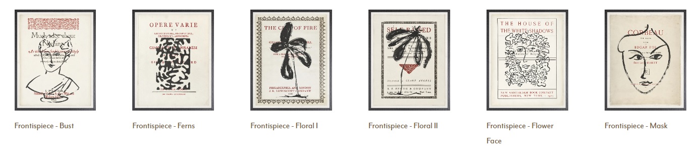 The “Frontispiece Series” literally sandwiches the new and the old. A frontispiece is the decorative illustration which faces a book’s title page and the artist has overlapped her graphic black ink drawings over famous title pages of vintage books. You’ll love the assortment of Mask, Rabbit, Fern and Floral images of these wonderfully quirky pieces.