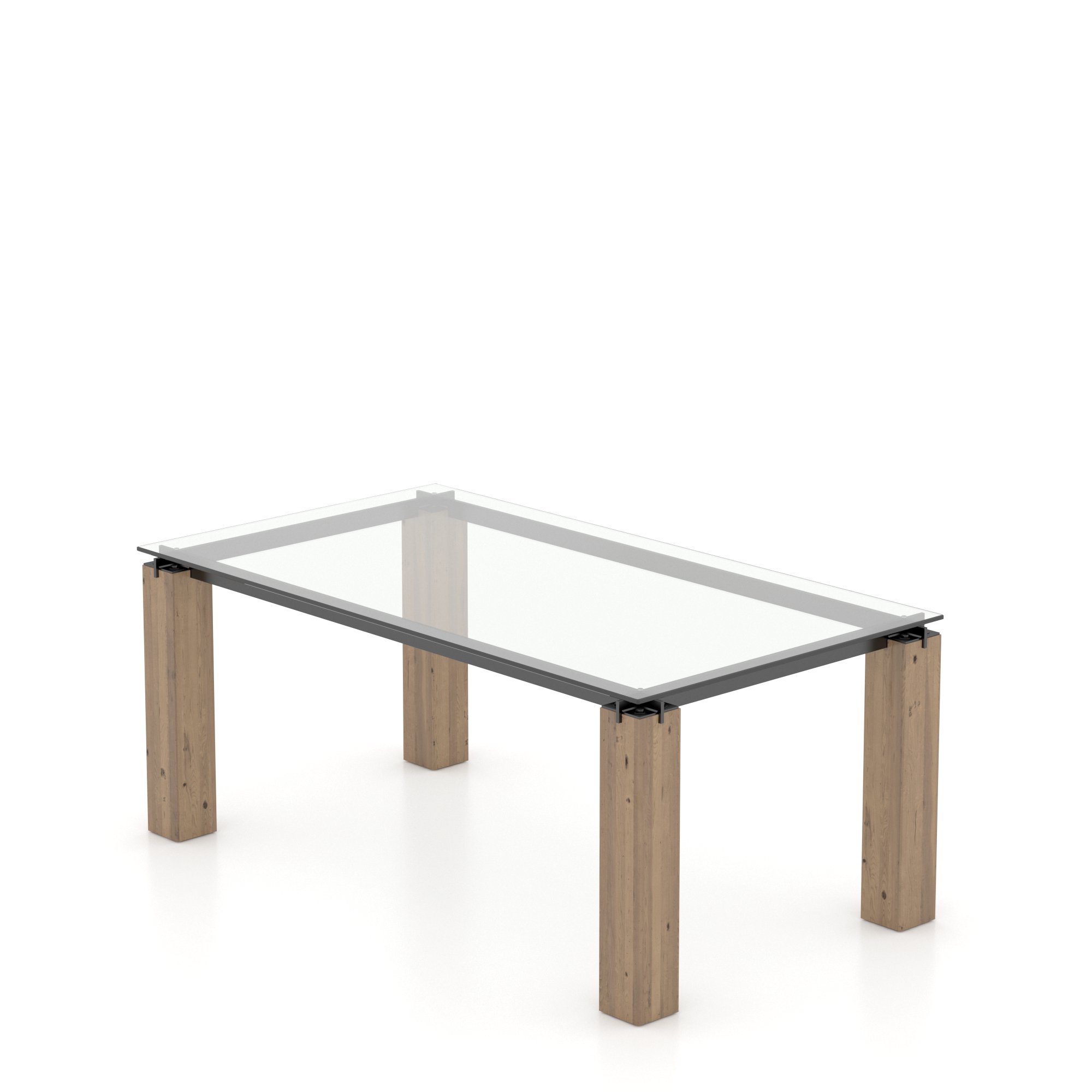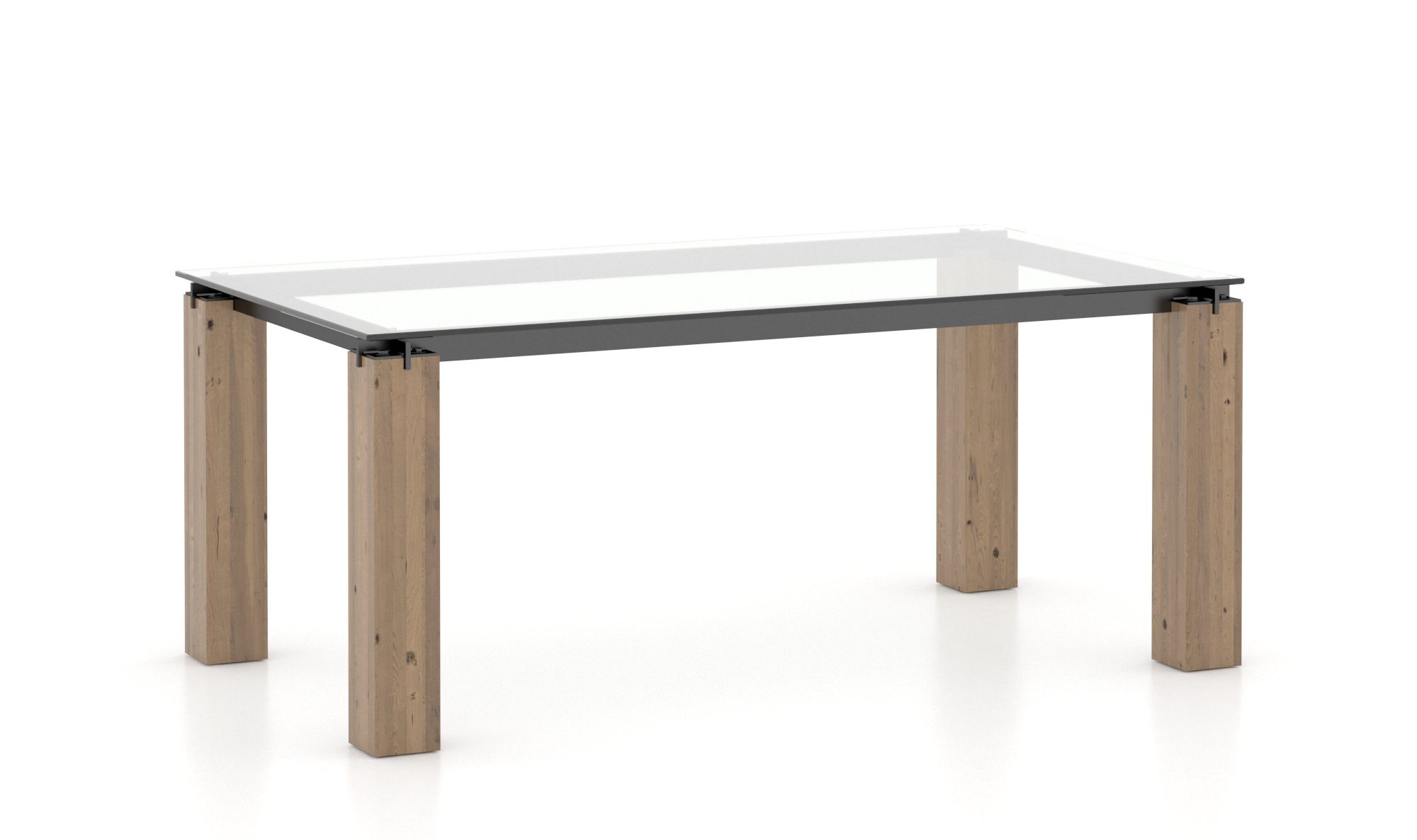 This remarkable table from the Loft collection combines a beautiful glass top with large wooden legs in a rustic finish, a result that is both minimalist and striking.