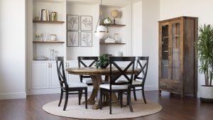 Here is a country-style round table with a wide, crafted base that showcases the richness and character of solid wood.